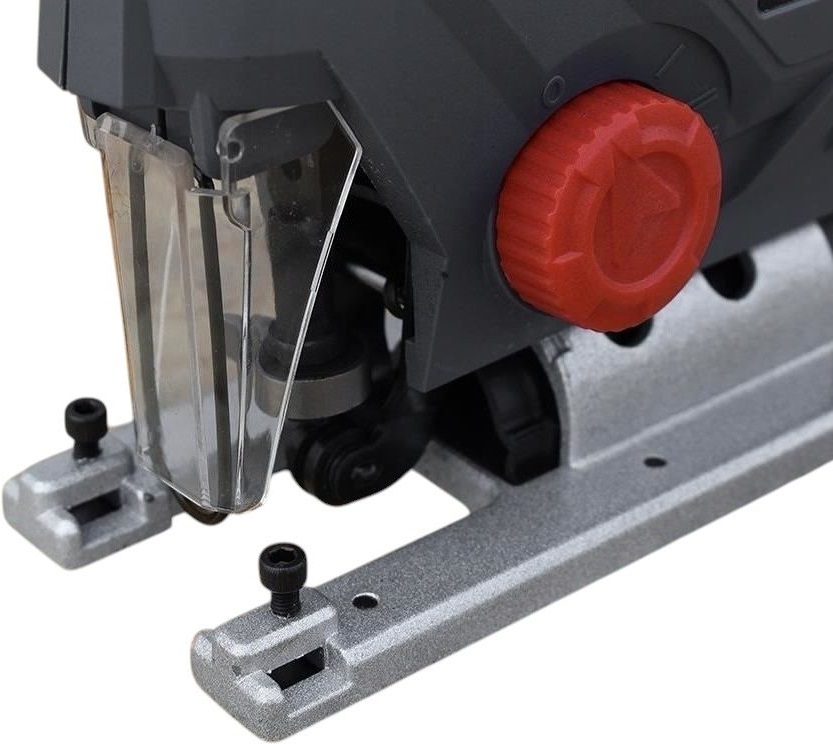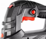 Пильне полотно (крок 18 мм) захищене прозорим кожухом з міцного полікарбонату, що забезпечує безпеку під час роботи. Руків’я оснащене зручним вимикачем з блокуванням та покрите протиковзним матеріалом для комфортного та безпечного використання. Є система здування та відкидання тирси та пилу.