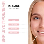 Засіб локальної дії Re.Care розроблений спеціально для делікатного усування прищів та почервонінь. Активними компонентами засобу є рожевий каламін та цинк, які забезпечують заспокоєння, абсорбцію надлишку шкірного сала, матування. Камфора у складі засобу володіє загоювальними, охолоджуючими та підсушуючими властивостями. Бісаболол покращує стан та зовнішній вигляд шкіри.