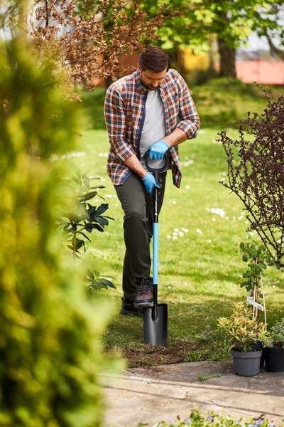 Загострені краї головки та її з'єднання з ручкою довгим і міцним зварним швом полегшують вхід лопати у твердий ґрунт, тому виріб чудово підходить для пересадки рослин та чагарників, а також копання дренажних канав, пристрою дренажу. труби або стовпи огорожі. Істотний вплив у цій справі має міцна металева підставка для ніг, що забезпечує підтримку при вбиванні голови в землю. Така структура не лише підвищує комфорт роботи, а й захищає виріб від пошкоджень.