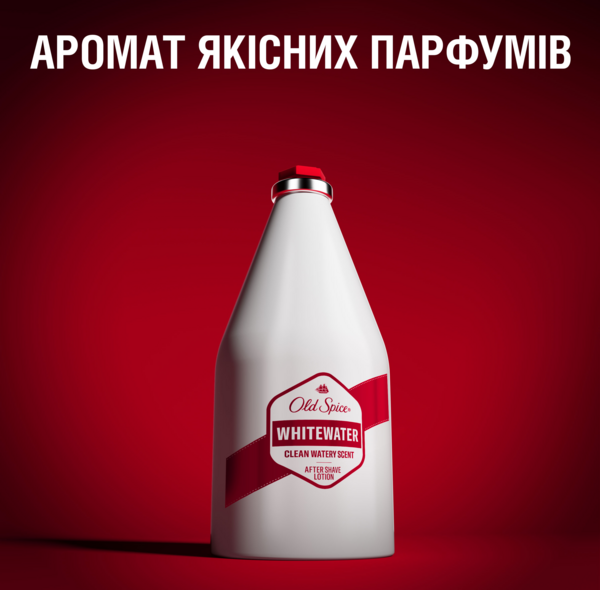 Відчуйте незабутній аромат якісних парфумів і фантастичну впевненість у собі з лосьйоном після гоління Old Spice Whitewater для чоловіків. Маючи потужний аромат якісних парфумів, цей лосьйон допомагає охолодити, стимулювати й освіжити шкіру після гоління. Проведіть лосьйоном по обличчю та шиї після гоління і миттєво відчуйте свіжість. Шкіра заряджається бадьорістю, тож ви можете зосередитися на більш важливих заняттях, таких як укласти угоду або навчити дельфінів говорити. Спробуйте аромат якісних парфумів Whitewater і вирушайте в подорож ароматами. Цей підбадьорливий аромат свіжої води, сандалового дерева, з цитрусами та нотками бурштину надасть вам чарівний аромат.