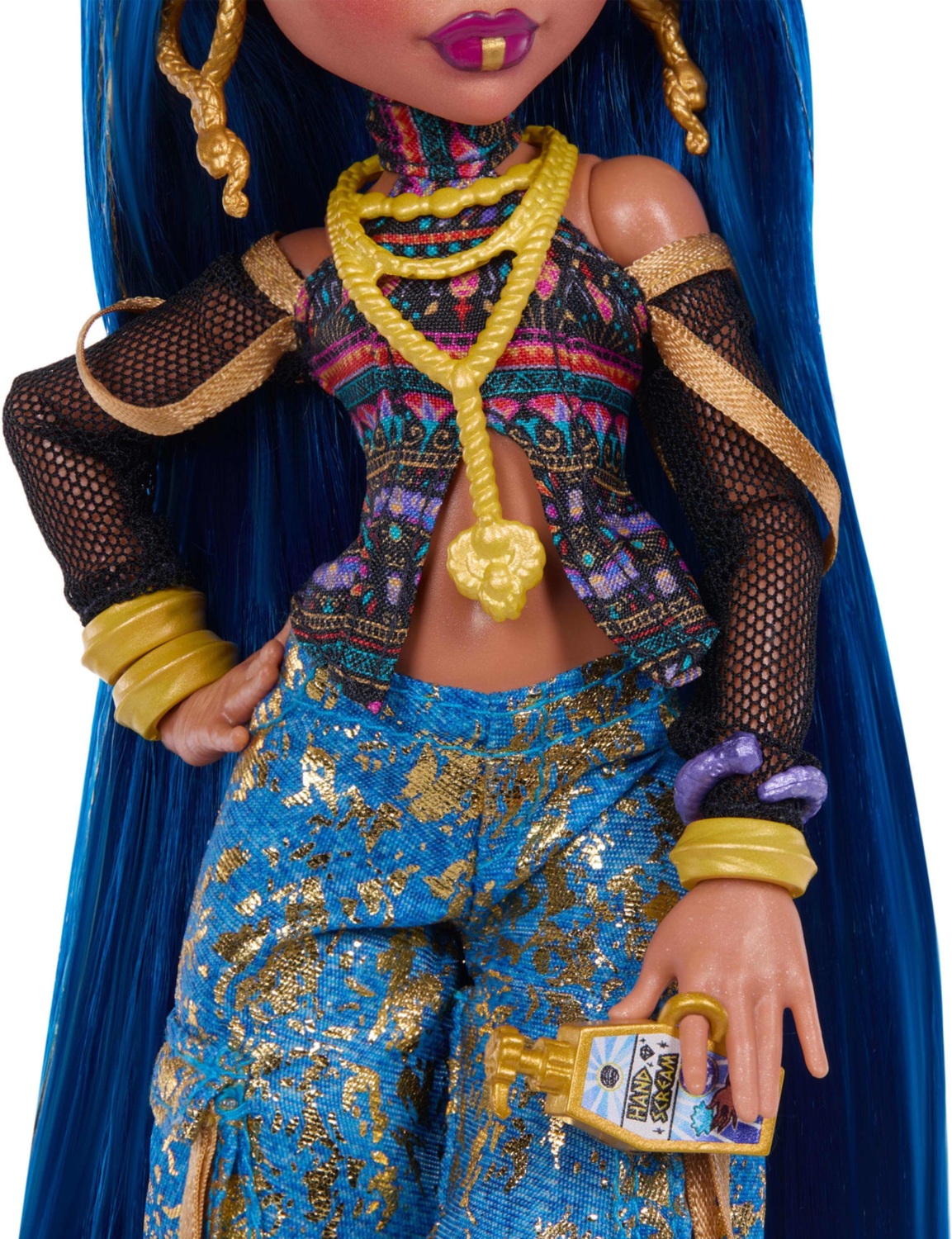 Зовнішній вигляд ляльки Клео надзвичайно величний. Зі своєю улюбленою коброю Хіссетт та 7 аксесуарами вона готова стильно керувати студентським колективом Monster High. Клео поєднує укорочений топ-халтер із джинсовими штанами-карго з золотистими вкрапленнями. Сітчасті рукави, мерехтливі стрічки та золоті акценти додають королівської крутості від голови до п’ят.