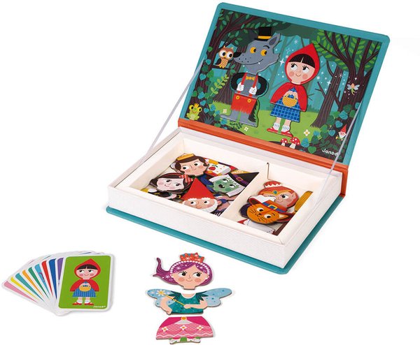 Магнітна гра «Казки» французького бренду Janod зовні нагадує звичайну книгу. Але під її обкладинкою – цікава головоломка для дітей від 3 до 8 років. Гра містить картки з підказками і магнітні елементи зображень казкових героїв, з яких треба складати повноцінні картинки. Діти можуть фантазувати і складати героїв так, як їм заманеться: відповідно до завдань на картках або як підкаже уяву. Складати картинки можна на будь-який магнітної дошці. Практична упаковка дозволяє легко транспортувати іграшку, щоб діти могли розважатися Не тільки вдома, але і в подорожах або під час прогулянки. Іграшку виготовлено з якісних матеріалів з впровадженням нешкідливих фарб. Набір складається з 30 магнітів і 10 карток із зображенням казкових персонажів. Для дітей від 3-х років.