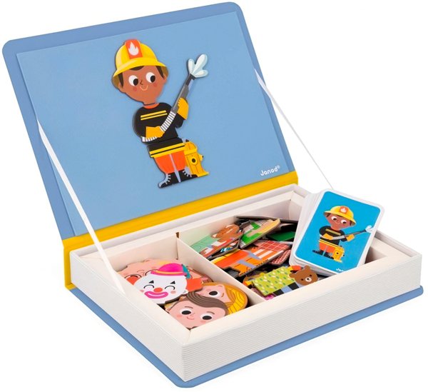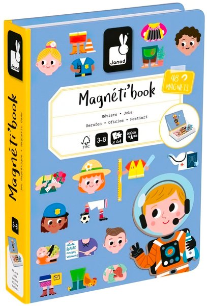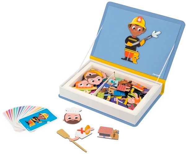 Які винахідливі професії вигадають діти? За допомогою цієї книжки Magnéti'Book, присвяченої професіям, діти віком від 3 років зможуть познайомитися з 16 реальними професіями, а також вигадати безліч своїх власних! Magnéti'Books - це магнітні коробки, що містять безліч магнітів, які можна прикріпити до магнітної поверхні. Веселощі починаються з того, що діти реконструюють картки-моделі, знаходячи потрібні елементи і поміщаючи їх у потрібне місце. Потім вони можуть дати волю своїй уяві та створити свої власні завдання, перемішавши магніти! Практично: коробка, що легко закривається, містить 48 магнітів, 16 ігрових карток, і її можна брати з собою куди завгодно! Ця магнітна іграшка для раннього навчання виготовлена з картону FSC.