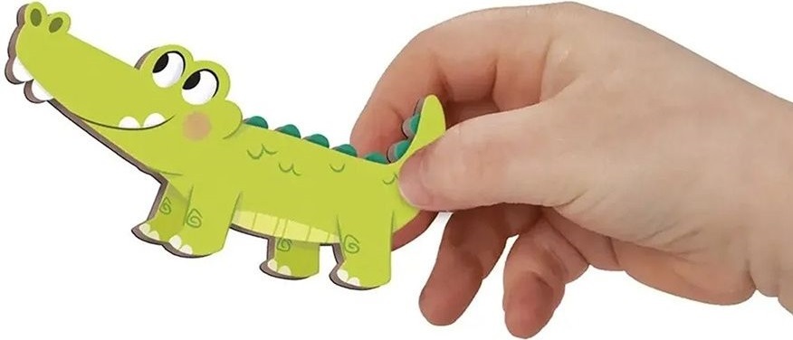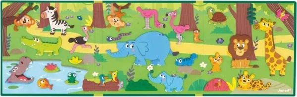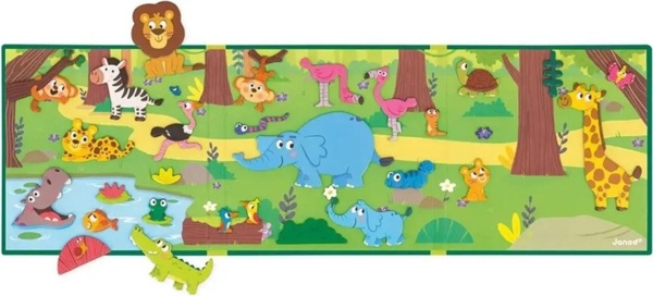 Ця гра складається з 30 магнітів та ілюстрованої дошки в яскравих кольорах. Лев, слон, мавпа, сурикат і навіть піранья терпляче чекають на нові пригоди, які вигадає дитина. Магнітний фон також розроблений з урахуванням можливості спільного використання. Його можна поставити вертикально, щоб допомогти малюкам розповідати про свої вигадані пригоди. Ця магнітна гра виготовлена з сертифікованого картону та безпечних матеріалів.