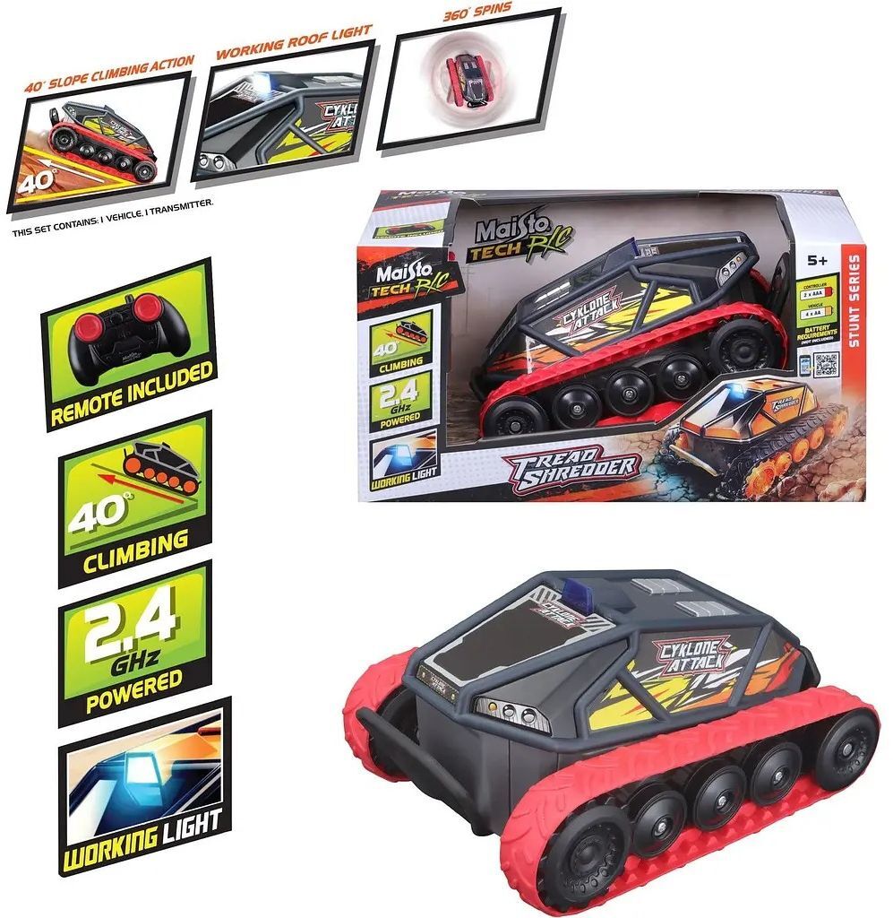Cyclone Attack від Maisto точно вразить тебе своєю крутістю, ефектним корпусом та яскравістю. Адже перед тобою радіокерований усюдихід на гусеничному ходу