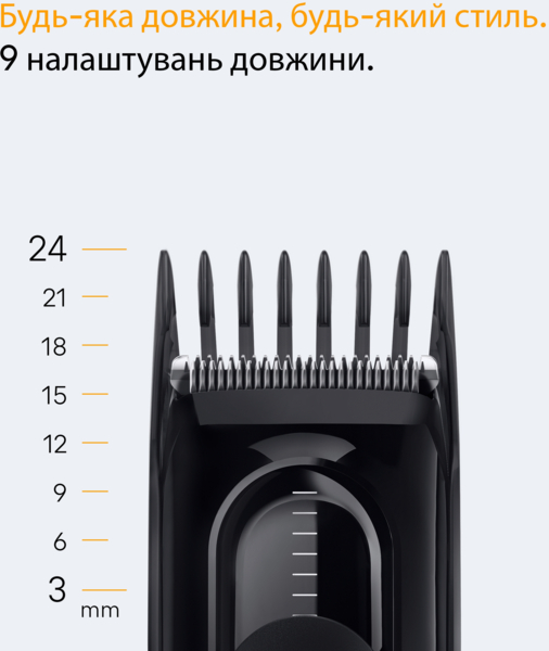 | Комплектація (можливі зміни в різних поставках) | Документація, Зарядний пристрій, Машинка для стрижки, Насадка, Щітка для чищення |
