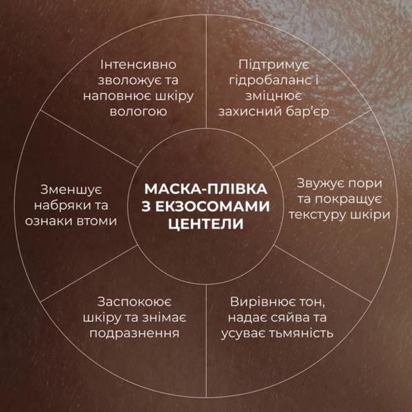 Блакитна незмивна маска-плівка з екзосомами центели, гіалуроновою кислотою та вітаміном С створена для інтенсивного відновлення та зволоження шкіри. Завдяки інноваційним компонентам формула поєднує потужну антиоксидантну дію з ефектом глибокого зволоження та детоксикації. Маска допомагає відновити рівний тон, усуває тьмяність і сліди втоми, зменшує набряки й повертає шкірі природне сяйво та свіжість.
