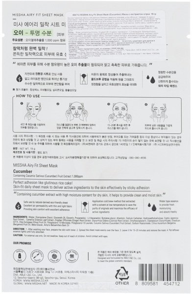 Маска для обличчя Missha Airy Fit Sheet Mask Cucumber Огіркова 19г