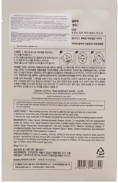 Joyful Time Essence Mask Aloe - тканинна маска з екстрактом соку алое. Екстракт алое є універсальним компонентом і підходить для догляду за будь-яким типом шкіри: чинить зволожувальну, заспокійливу, оздоровлювальну дію, нормалізує роботу сальних залоз, сприяє звуженню пор. Маска з екстрактом алое сприяє миттєвому зволоженню шкіри, заспокоює і розслабляє її, усуває сухість і лущення, знімає стрес після вмивання агресивними очисними засобами. Особливо незамінна маска буде після тривалого впливу ультрафіолету. Серія тканинних масок для шкіри обличчя, серії Joyful Time, містять насичену есенцію, яка ефективно піклується про шкіру обличчя, дає змогу позбутися шкірних проблем, підвищує тонус шкіри, вирівнює тон обличчя, підвищує еластичність і загальне здоров'я шкіри, даючи їй змогу швидко відновитися й набути здорового вигляду. Маски на тонкій тканинній основі (біоцелюлоза), що не викликає подразнень, дає змогу щільно прилягати до шкіри обличчя та переносити глибоко в шкіру корисні компоненти есенції маски. Розрахована на одне застосування, не вимагає великої кількості сил і часу та однаково зручна як для регулярних домашніх процедур, так і в подорожах.