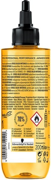 Пляшка виготовлена зі 99% переробленого матеріалу, за виключенням кришки та етикетки. Формула містить 70% інгредієнтів природного походження (включаючи воду). Маска SYOSS Oleo Intense має веган-формулу, отже не містить інгредієнтів тваринного походження.