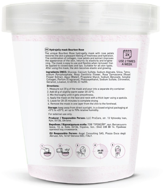 Унікальна гідрогелева маска Bourbon Rose з пелюстками троянди дарує шкірі приємні відчуття свіжості і зволоженості. Має вигляд порошку з пелюстками троянд і при контакті з водою перетворюється в однорідну густу гідрогелеву консистенцію. Маска застигає, а її компоненти починають активно діяти, проникаючи в глибинні шари епідермісу.