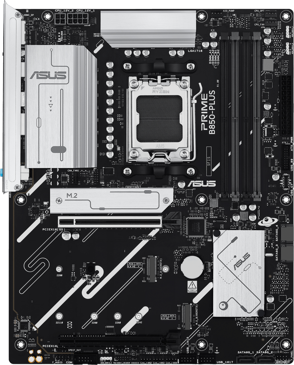 Материнська плата PRIME B850-PLUS-CSM оснащена декількома вбудованими радіаторами та набором гібридних вентиляторів, щоб забезпечити прохолоду та стабільну роботу вашої системи під час інтенсивних робочих навантажень.