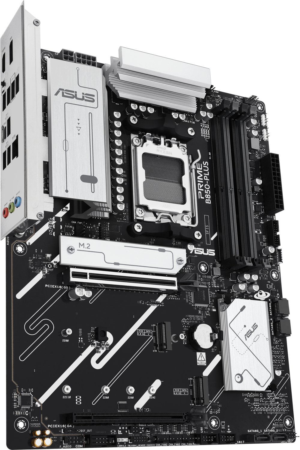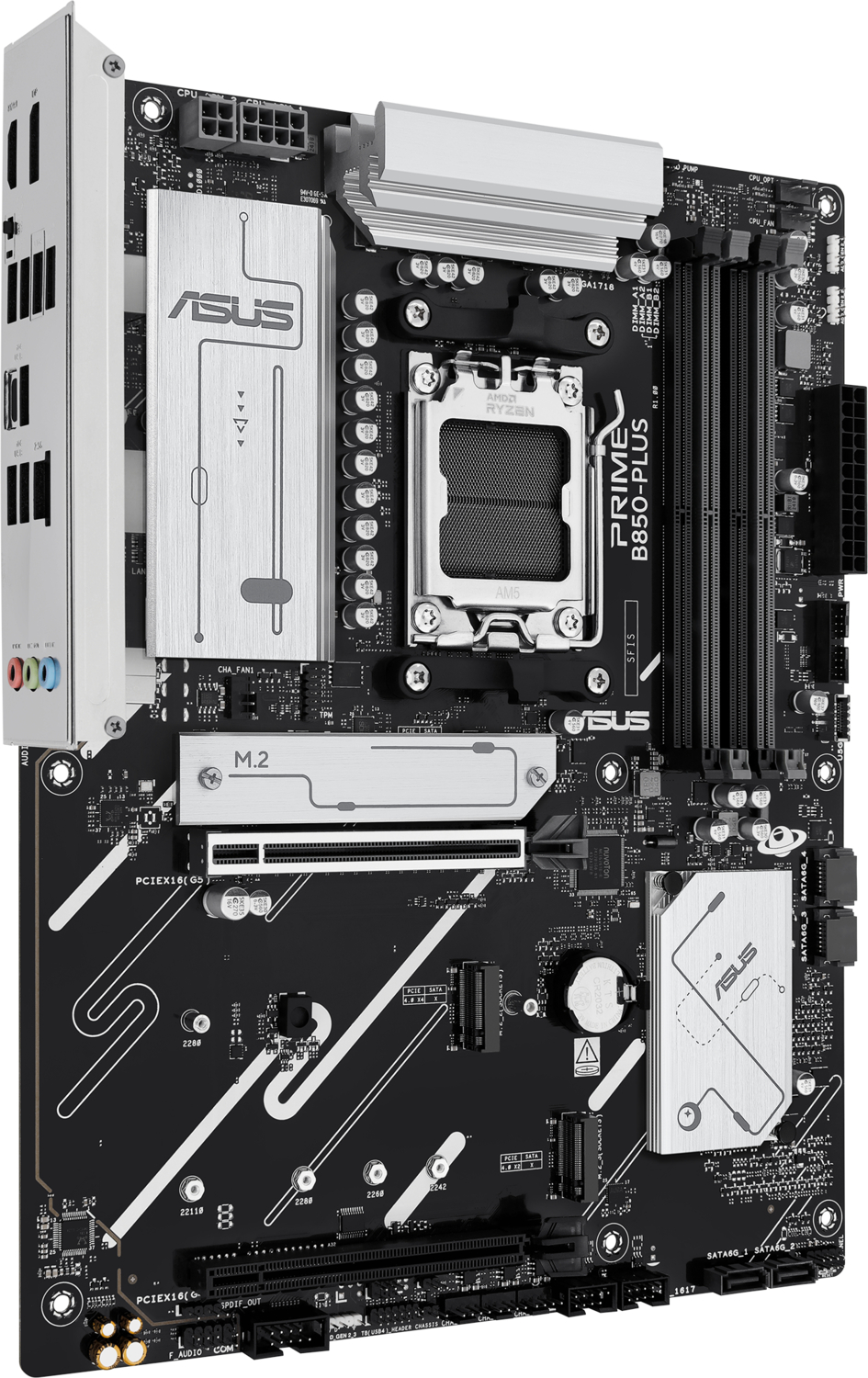 PRIME B850-PLUS має три слоти M.2, один з яких підтримує швидкість передачі даних до 128 Гбіт/с через інтерфейс PCIe 5.0, а два - через PCIe 4.0. Це дає змогу пришвидшити час завантаження операційної системи та програм за допомогою накопичувачів.