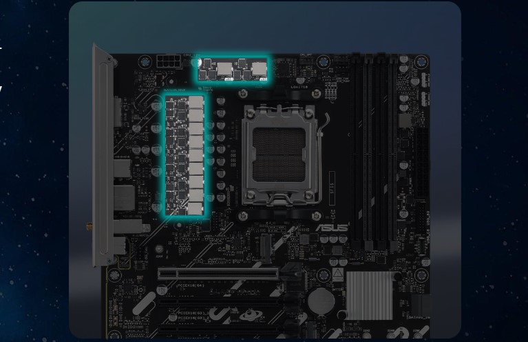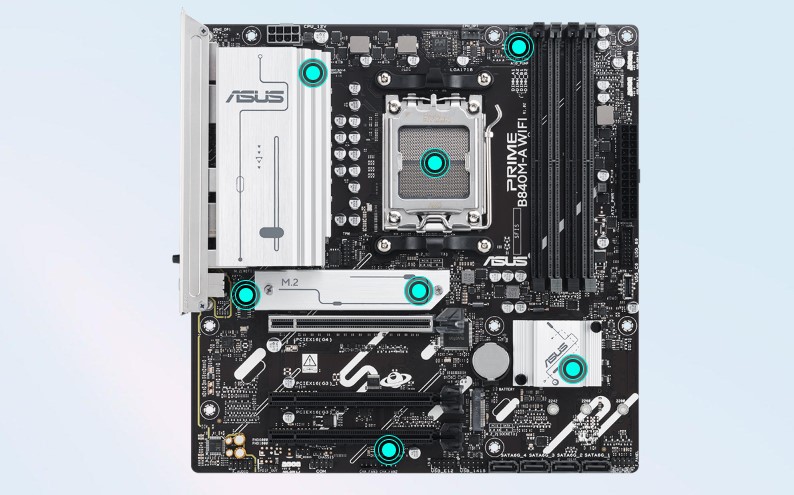 Материнська плата Prime B840M-A WiFi обладнана кількома вбудованими радіаторами і безліччю роз'ємів для вентиляторів, щоб забезпечити стабільну роботу вашої системи за інтенсивних навантажень.