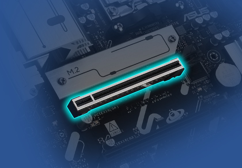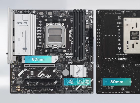Prime B840M-A WiFi пропонує загалом три слоти M.2, зокрема два зі швидкістю передавання даних до 64 Гбіт/с через PCIe 4.0 і один із підтримкою PCIe 3.0. Це дає змогу прискорити завантаження і завантаження застосунків із дисків з ОС або застосунками.