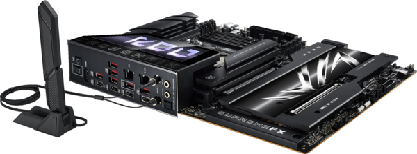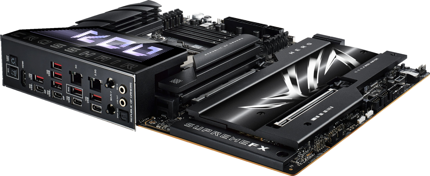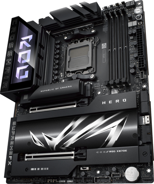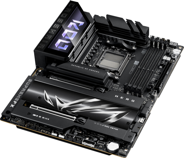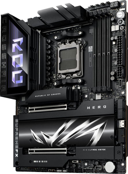 Материнська плата ROG Crosshair X870E Hero для ПК зі штучним інтелектом пропонує непохитну потужність, надійне терморегулювання, високошвидкісне підключення, комплексну підтримку PCIE 5.0 і DDR5 для розкриття продуктивності процесорів AMD Ryzen. На цій материнській платі переважають темні відтінки, що привертають увагу до преміальних металевих текстур, нікельованих поверхонь, плавних контурів і стереоскопічного візуального ефекту на великому радіаторі M.2 і радіаторі чипсета. Ця плата також має наш ефект Polymo Lighting II. Цей модернізований модуль підсвічування, вбудований у кожух вводу/виводу, забезпечує більш динамічне RGB-підсвічування фірмового логотипа ROG.