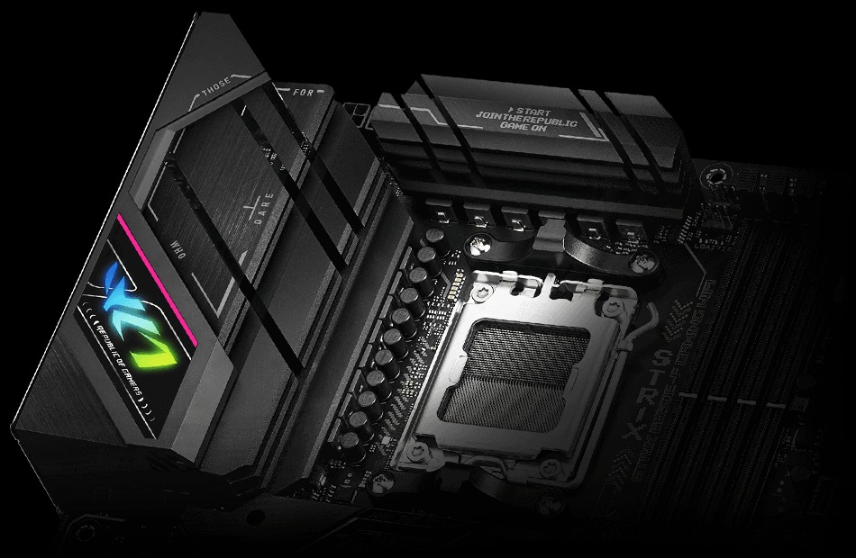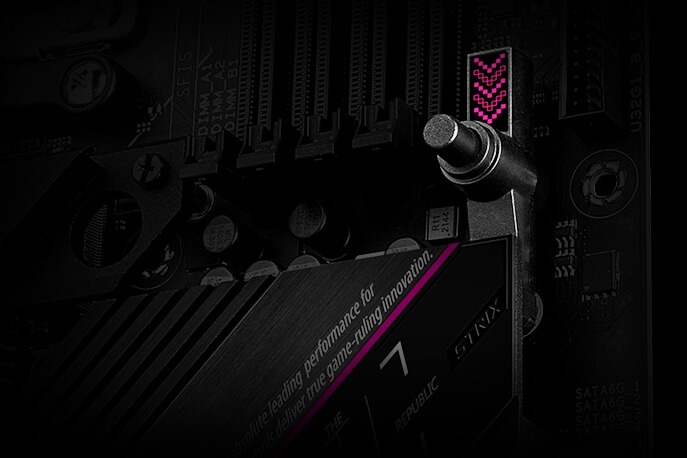 Темна гама кольорів цієї плати підкреслюється яскравими деталями та логотипом з регульованим RGB-підсвічуванням. Поєднання стилю та функціональності ілюструє кожух інтерфейсів із вирізами, через які додатковий повітряний потік проходить у канали поруч розташованого радіатора VRM. Створіть унікальну ігрову збірку, що відображатиме ваш особистий стиль, поєднавши Strix B650E-F з іншими продуктами багатої екосистеми ROG.