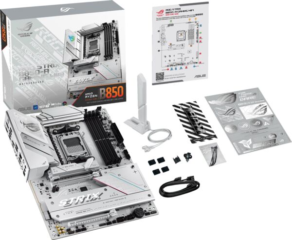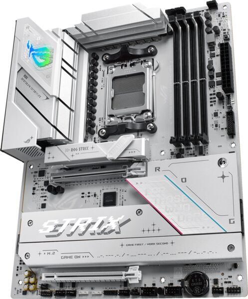 ROG Strix B850-A виділяється своєю вражаючою білою друкованою платою, пропонуючи свіжий і сучасний естетичний вигляд, який бездоганно доповнює практично будь-яку збірку системи. Металеві радіатори підкреслюють її чистий і чіткий вигляд, а ледь помітне RGB-підсвічування на панелі вводу/виводу дає змогу зберегти витончений, стриманий зовнішній вигляд або продемонструвати сміливий, яскравий дизайн.