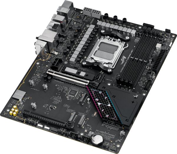 ROG Strix B850-F має витончений і стриманий дизайн, що дає змогу легко поєднувати його з широким спектром системних компонентів. Її чорна друкована плата та металеві радіатори створюють темний і насичений вигляд, а підсвічування RGB на панелі вводу/виводу дозволяє вам залишатися непомітним або зробити сміливу заяву.