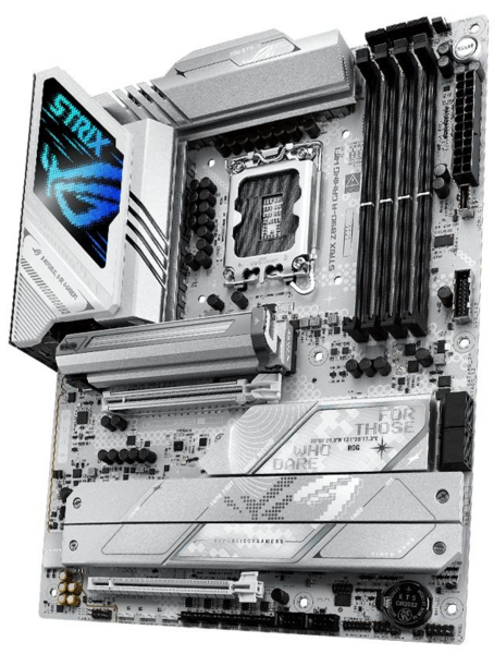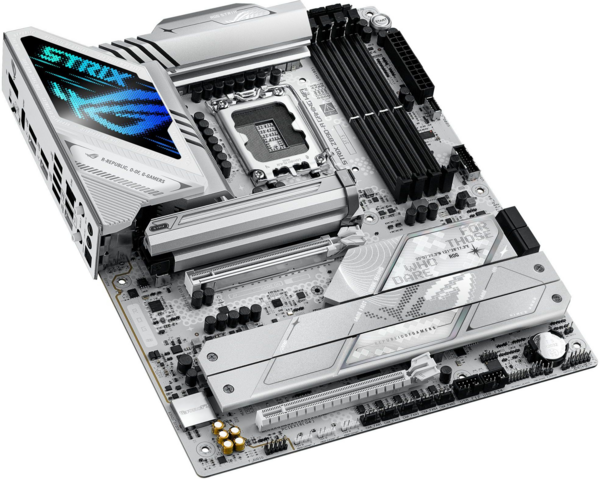 ROG Strix Z890-A має гладку білу поверхню для сучасного та стильного вигляду, який легко вписується в більшість систем. Металеві радіатори доповнюють лаконічний дизайн, а тонке підсвічування Polymo на панелі вводу/виводу дає змогу вибрати між вишуканим мінімалістичним виглядом і яскравим дисплеєм, що привертає увагу.