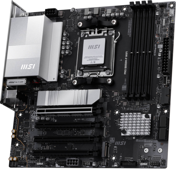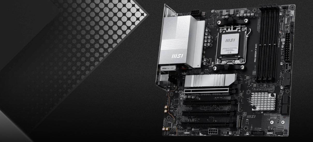 PRO B850-P WIFI пропонує простий дизайн з гармонійною сріблястою кольоровою гамою, яка ідеально поєднується як з білими, так і з чорними корпусами ПК. Він оснащений багатьма ексклюзивними функціями MSI, включаючи справжній Wi-Fi 7 з антеною EZ Antenna, 5G LAN, PCIe 5.0 M.2 з EZ M.2 Shield Frozr II та додатковим живленням PCIe, готовим до роботи з процесорами AMD Ryzen серії 9000.