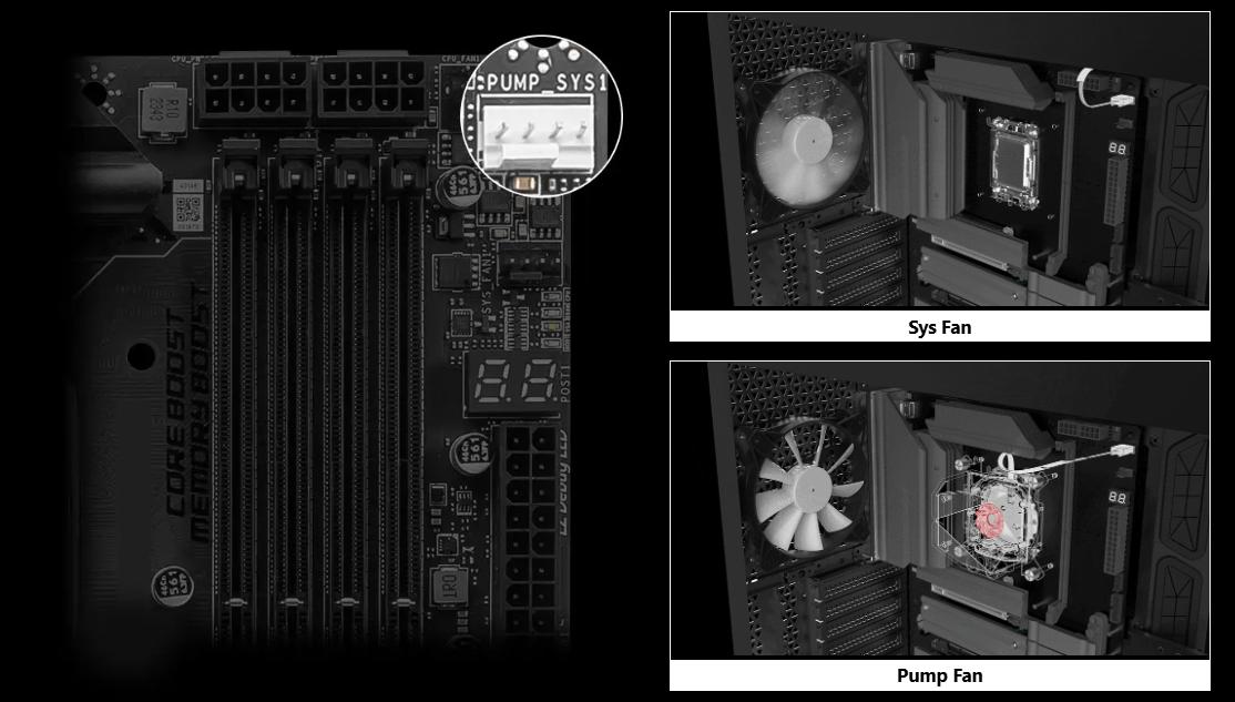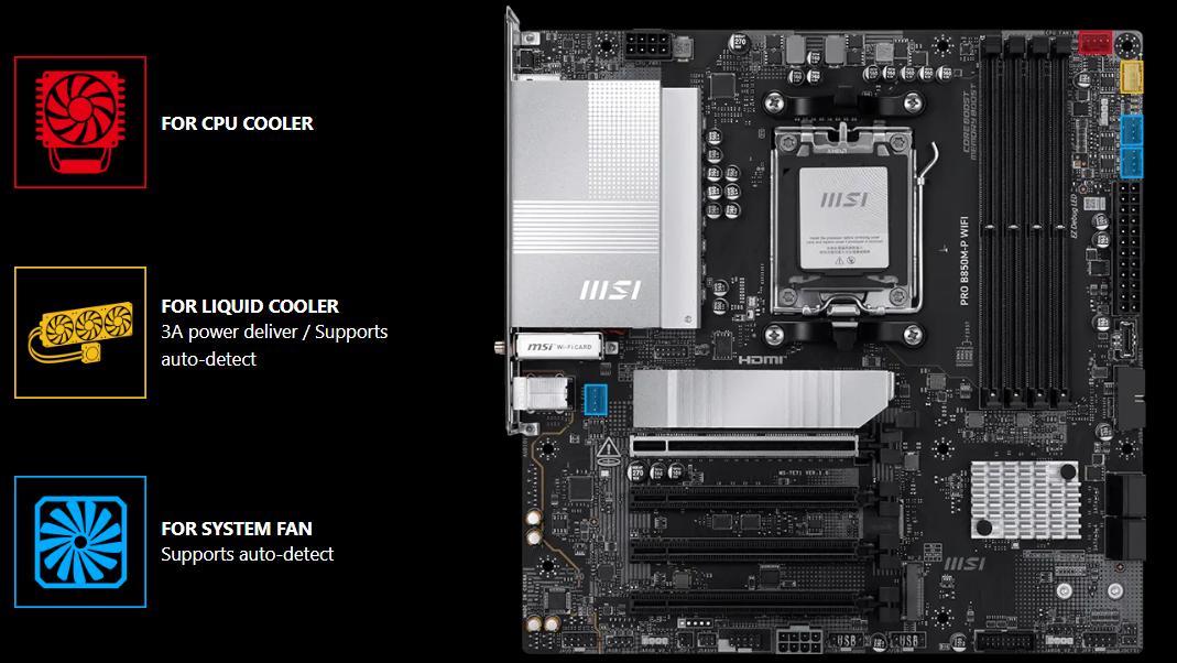 Підключення та синхронізація з кулерами та корпусами MSI завдяки стратегічно розташованим контактним роз'ємам, у тому числі спеціальному роз'єму для помпових вентиляторів.