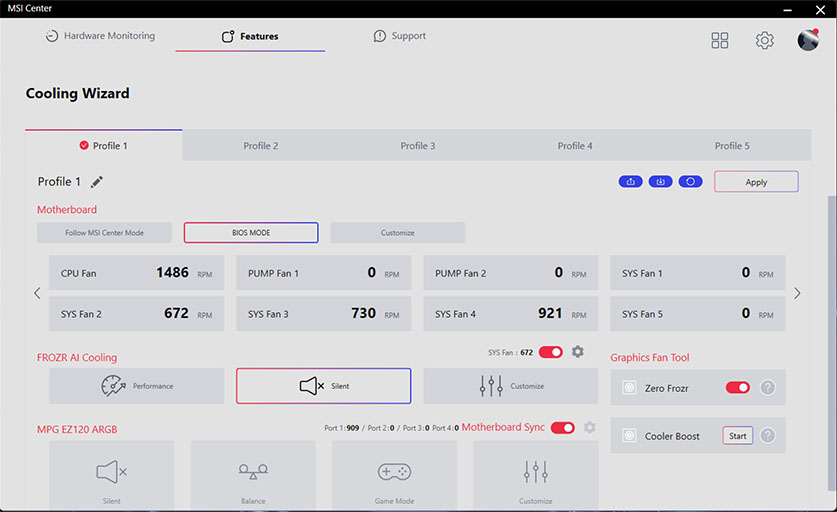 Майстер охолодження слугує комплексним рішенням для керування налаштуваннями вентиляторів у всіх продуктах MSI. Він забезпечує чудову продуктивність охолодження та зниження рівня шуму для вашого ігрового ПК, пропонуючи сумісність з вентиляторами та помпами з PWM/DC струмом, можливість налаштування параметрів та інтуїтивно зрозумілий моніторинг температури для оптимальної роботи одним клацанням миші.