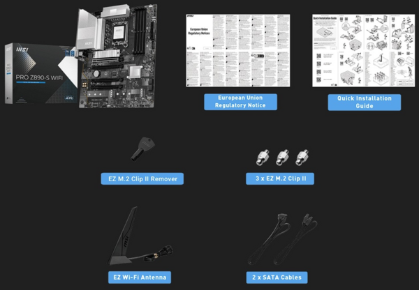 | Комплектація (можливі зміни в різних поставках) | Антена WiFi, Гвинт для роз'єму M.2 – 3 шт., Документація, Інструкція із встановлення, Інструмент для встановлення затискача M.2, Кабель SATA – 2 шт., Материнська плата |