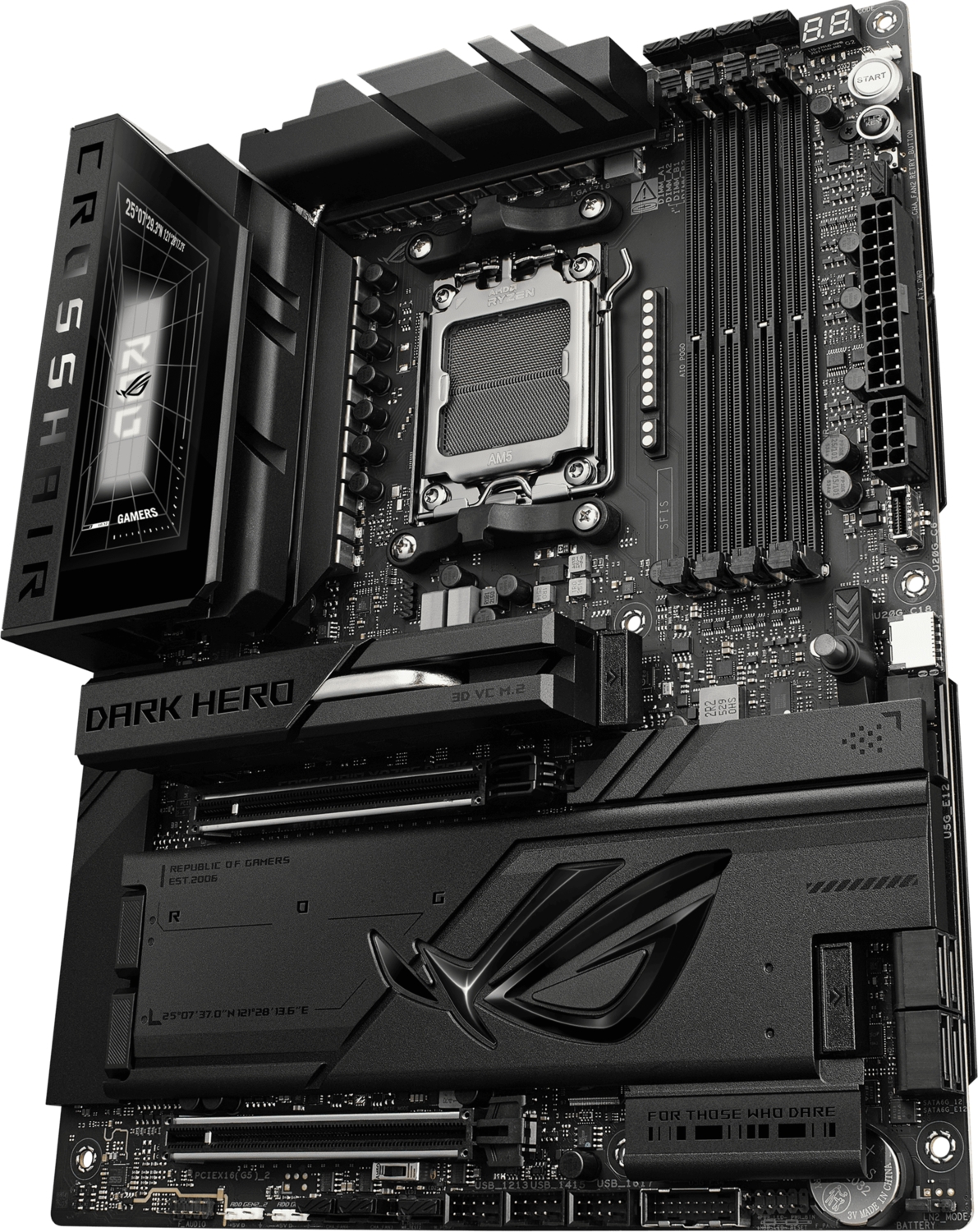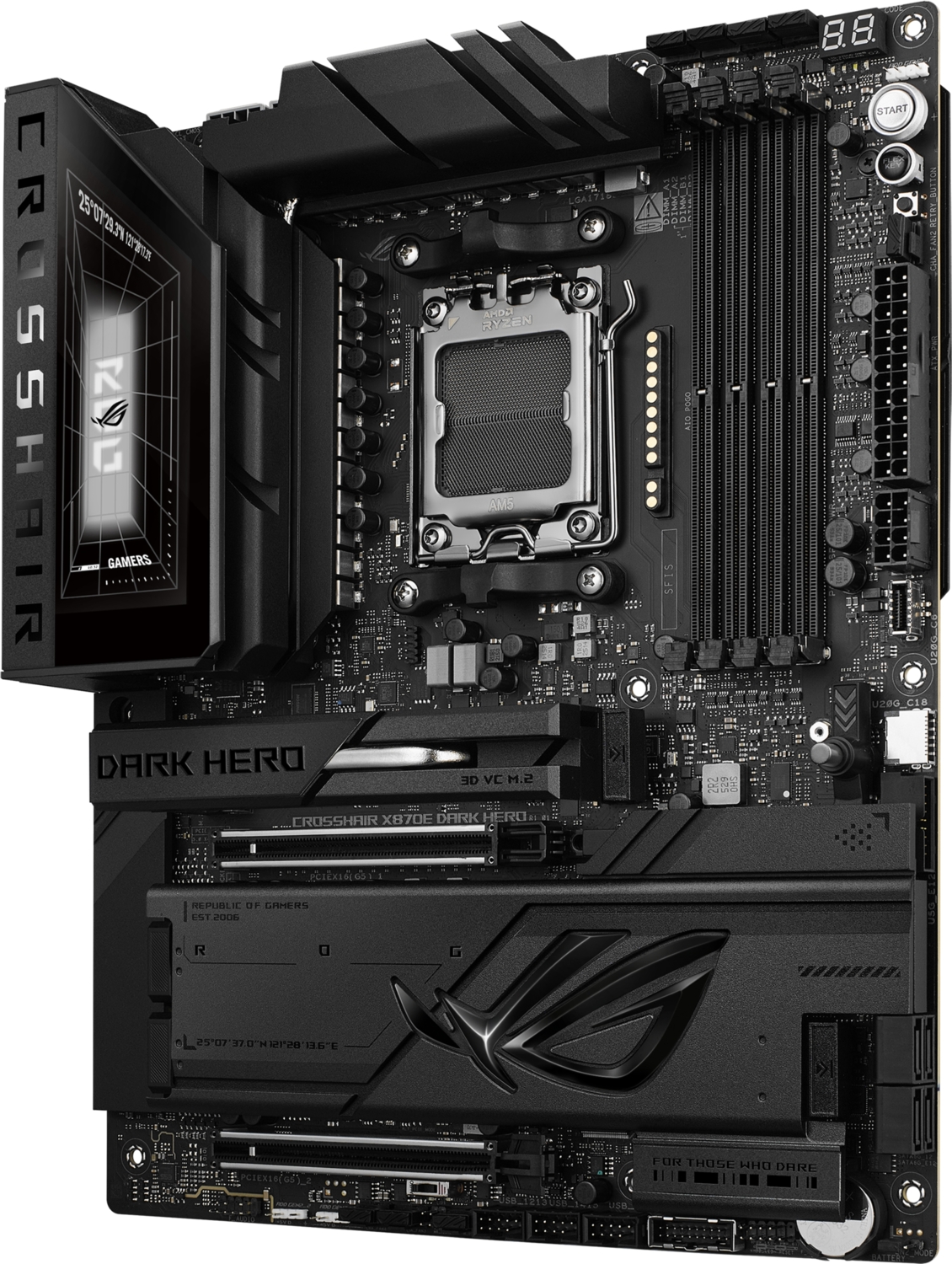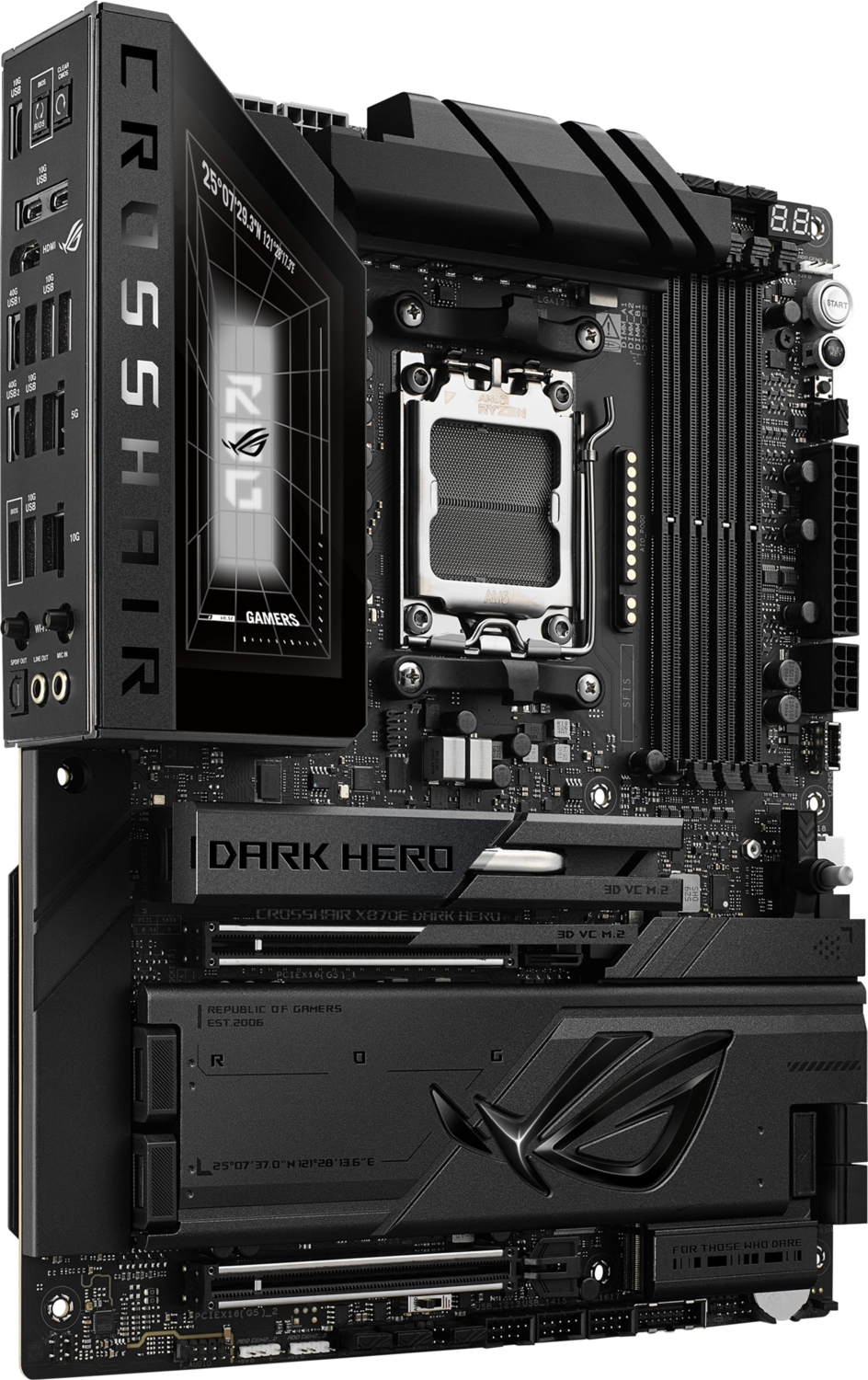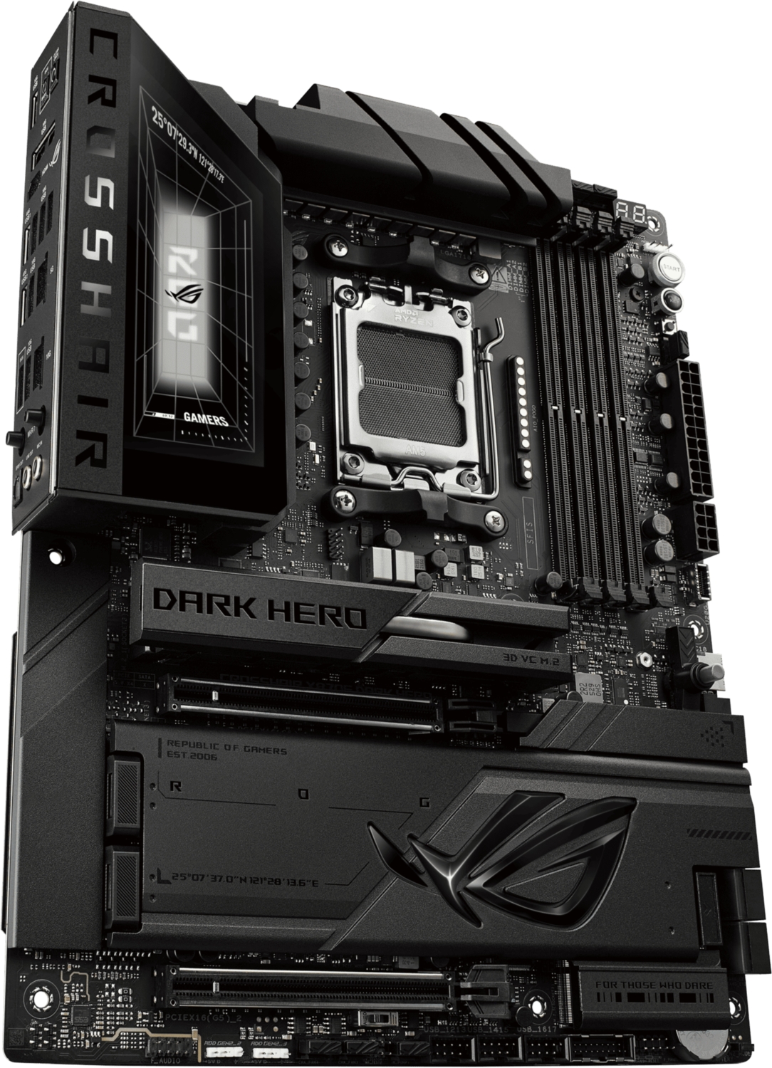 ROG Crosshair X870E Dark Hero має п'ять вбудованих слотів M.2, два з яких підтримують інтерфейс PCIe 5.0, що забезпечує вражаючу швидкість 16 ГБ/с, а інші - все ще вражаючі 8 ГБ/с через інтерфейс PCIe 4.0. Обидва слоти розширення x16 підтримують інтерфейс PCIe 5.0 з неймовірною швидкістю до 64 ГБ/с для сумісних пристроїв і повністю підтримують відеокарти нового покоління. Щоб витримати вагу масивних відеокарт, ці слоти також захищені фіксаторами SafeSlot. Крім того, завдяки кнопці PCIe Slot Q-Release, відеокарту можна легко від'єднати від слота.