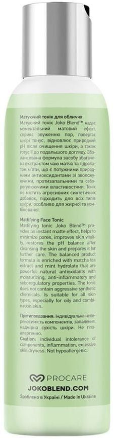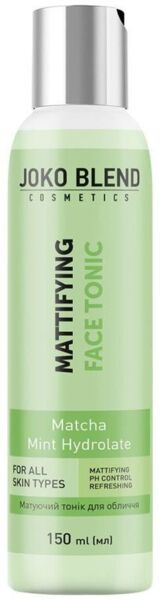 Матуючий тонік Joko Blend надає моментальний матовий ефект, сприяє звуженню пор, повертає шкірі тонус, відновлює природний pH після очищення шкіри, а також готує її до подальшого догляду. Тонік не містить агресивних синтетичних добавок, підходить для всіх типів шкіри, особливо для жирної та комбінованої. Використання декоративної косметики, погана екологія, неправильне харчування і недосипання, стреси негативно впливають на стан і зовнішній вигляд шкіри, в результаті чого можуть з'явитися такі проблеми, як почервоніння, лущення та свербіж. Матуючий тонік Joko Blend спеціально розроблений, щоб нейтралізувати негативні фактори, які впливають на шкіру, відновити її природний pH після очищення і підготувати до нанесення основного догляду. Збалансована формула засобу збагачена екстрактом чаю матча і гідролатом м'яти, що є потужними природними антиоксидантами зі зволожуючими, протизапальними і себорегулюючіми властивостями.