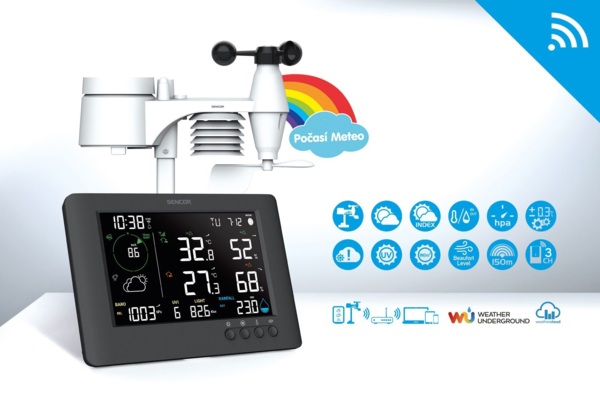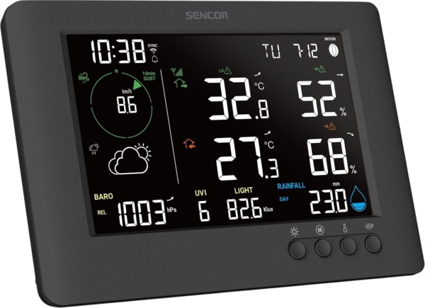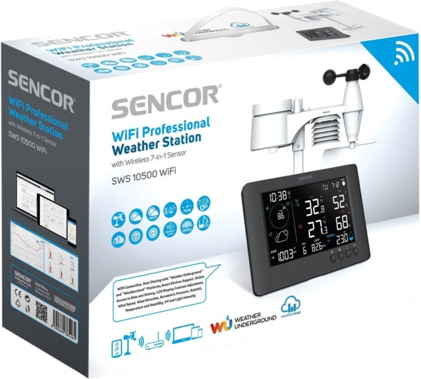 Професійна метеостанція Sencor SWS10500WIFI оснащена кольоровим РК-дисплеєм True Black з діагоналлю 5,7" (14,5 см), що забезпечує чітке відображення інформації. Дисплей має три рівні яскравості (високий, низький, вимкнений), а також функцію регулювання рівня контрастності для оптимального перегляду під різними кутами. Основний бездротовий датчик 7 в 1, що входить до комплекту, використовує високоякісні швейцарські сенсори Sensirion для вимірювання швидкості вітру, напрямку вітру, кількості опадів, температури, вологості, УФ-випромінювання та інтенсивності світла. Дальність передачі між основним блоком та датчиком на частоті 868 МГц сягає 150 м на відкритій місцевості.