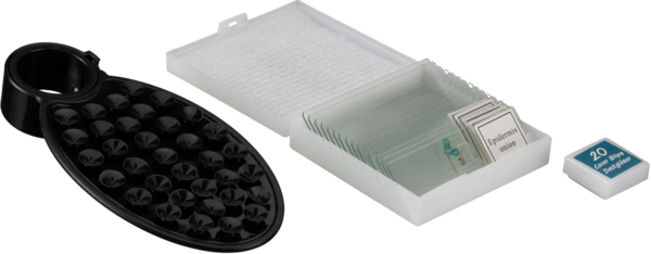 Під діафрагмою розташований фільтротримач для фільтрів стандартного діаметра 32 мм. Рухомий предметний столик із препаратоутримувачем, точними мікрометричними регулюваннями (грубим і тонким) і можливістю закріплення двох зразків одночасно забезпечує точне розміщення об'єкта під об'єктивом та його плавне переміщення у горизонтальній площині. Живлення мікроскопа здійснюється від змінних батарей найпоширенішого типорозміру АА (Alkaline) 1.5 V (допускається заміна акумуляторів AA Ni-Mg 1.2 V). Таким чином, мікроскоп може бути використаний у польових умовах без прив'язки до електромережі змінного струму. Мікроскоп поставляється в персональному пластиковому кейсі. Прилад та аксесуари розміщені у ложементах, вирізаних у поролоновій основі. Для легкого старту спостережень у комплекті з мікроскопом поставляється набір готових слайдів, предметного та покривного скла. Крім того, в комплектацію входить адаптер для смартфона (планшета). Адаптер кріпиться на тубусі мікроскопа і дозволяє проводити фото- і відеозйомку головною або передньою камерою гаджета. Гладка тильна сторона смартфона надійно кріпиться за допомогою безлічі присосок адаптера (у разі рифленої тильної поверхні смартфона рекомендується використовувати передню камеру).