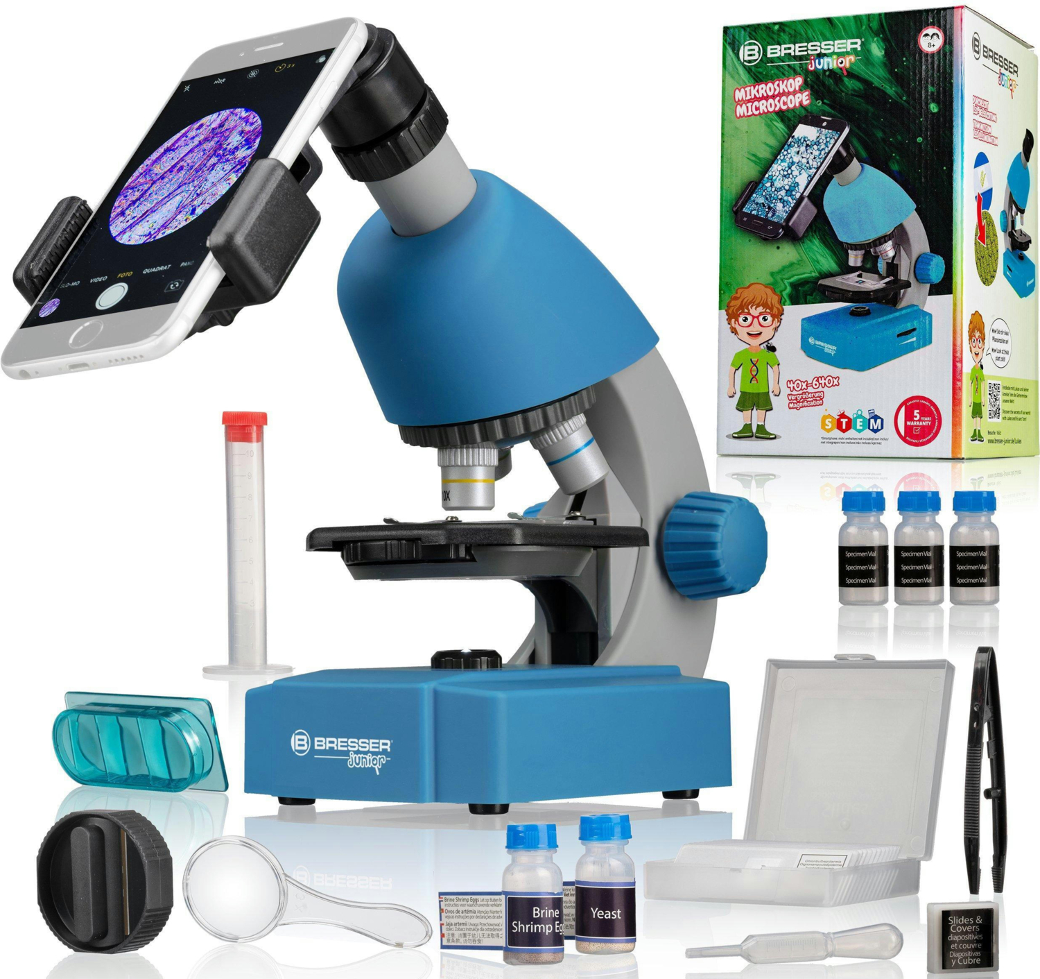 Bresser Junior 40x-640x являє собою сучасний мікроскоп для дитячого розвитку. Мікроскоп укомплектований великою кількістю різноманітних аксесуарів, готових слайдів для перегляду, оснащений револьверною головкою з трьома об'єктивами, що в комплексі із зум-окуляром дають збільшення до 640x.