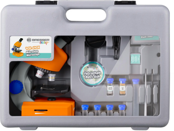 Мікроскоп Bresser Junior 40x-640x Orange з кейсом (8851310) є сучасним мікроскопом для дитячого розвитку. Мікроскоп укомплектований великою кількістю різних аксесуарів, готових для перегляду слайдів, оснащений револьверною головкою з трьома об'єктивами, що дають в комплексі з окуляром збільшення до 640х.