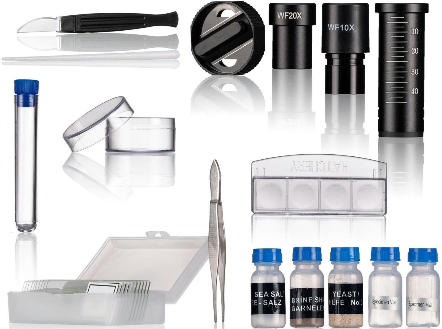 Мікроскоп укомплектовано всім необхідним для старту — від окулярів і об’єктивів до готових зразків і інструментів для препарування. Комбінація двох ширококутних окулярів і трьох об’єктивів забезпечує базове збільшення до 800х, а використання лінзи Барлоу дозволяє плавно масштабувати зображення до максимального збільшення 1600х.