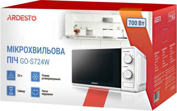 Мікрохвильова піч білого кольору з механічним управлінням. Потужність GO-S724W – 700 Вт, є шість рівнів регулювання, а внутрішній обсяг дорівнює 20 л.