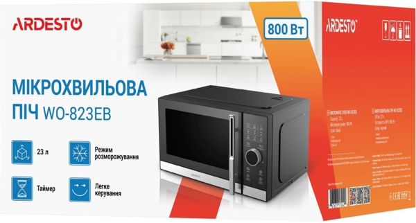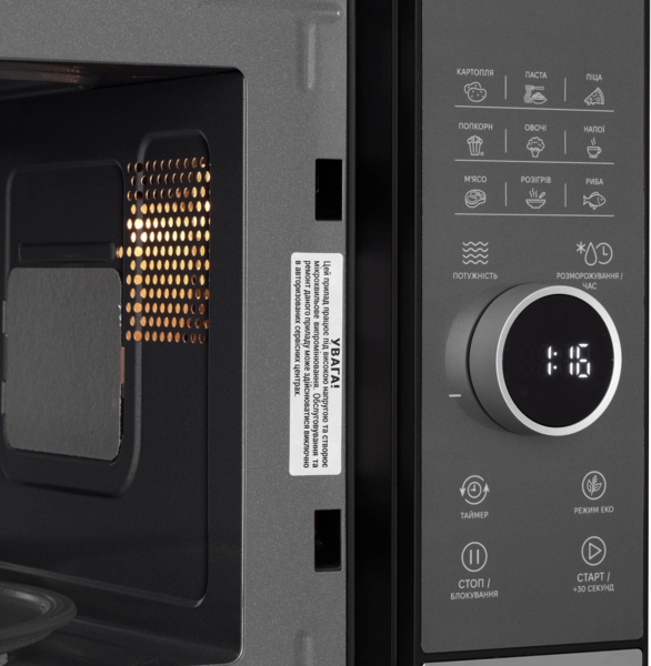 | Функції та можливості | Автоменю, Швидке розморожування, Швидкий розігрів, Розморожування за вагою, Розморожування, Розігрів, Таймер, Еко режим |
