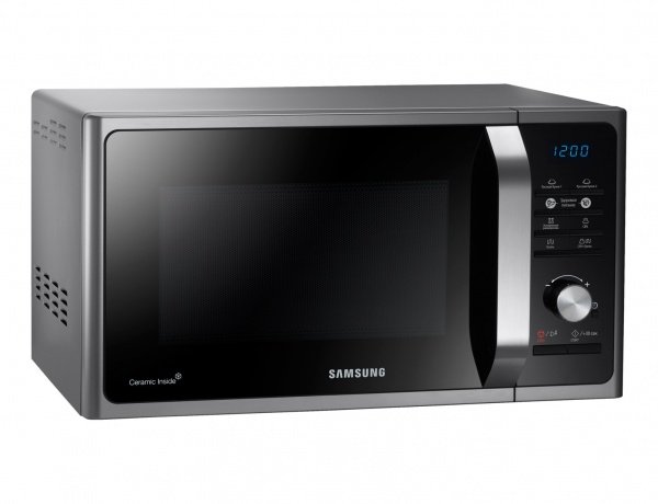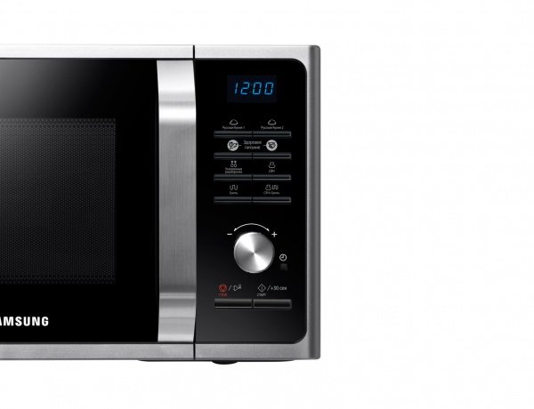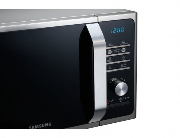 Нова мікрохвильова піч MS23F302TAK зі стильним дизайном, лицьовою панеллю з чорного скла, красивим дисплеєм синього світіння і сріблястим перемикачем стане прикрасою вашої кухні.