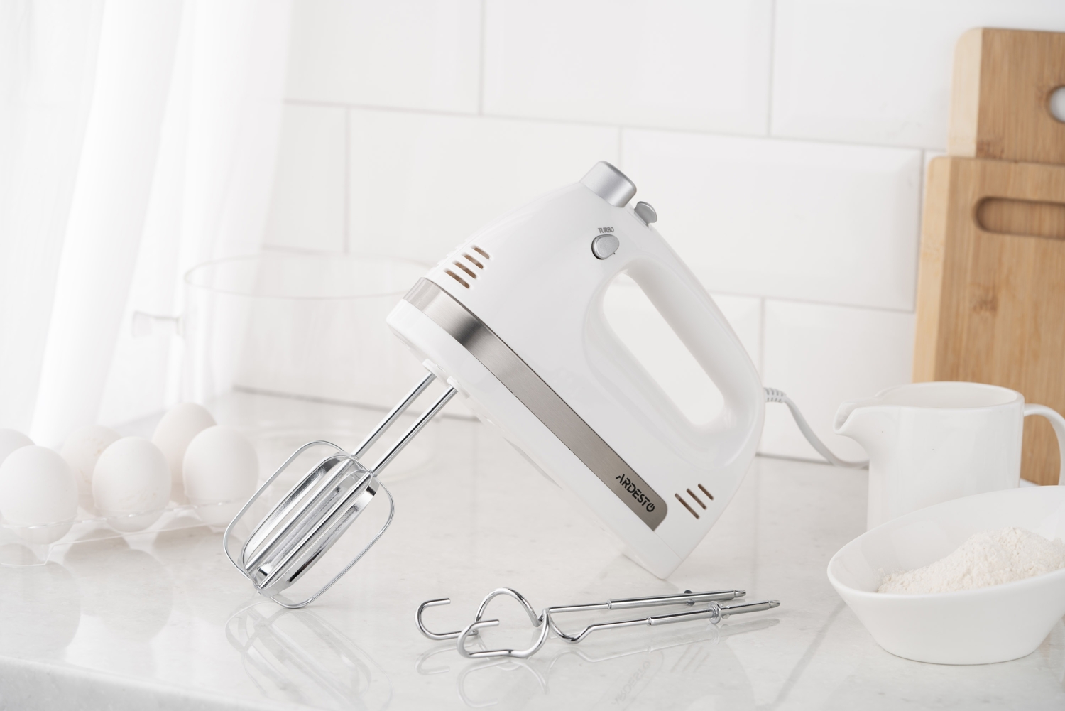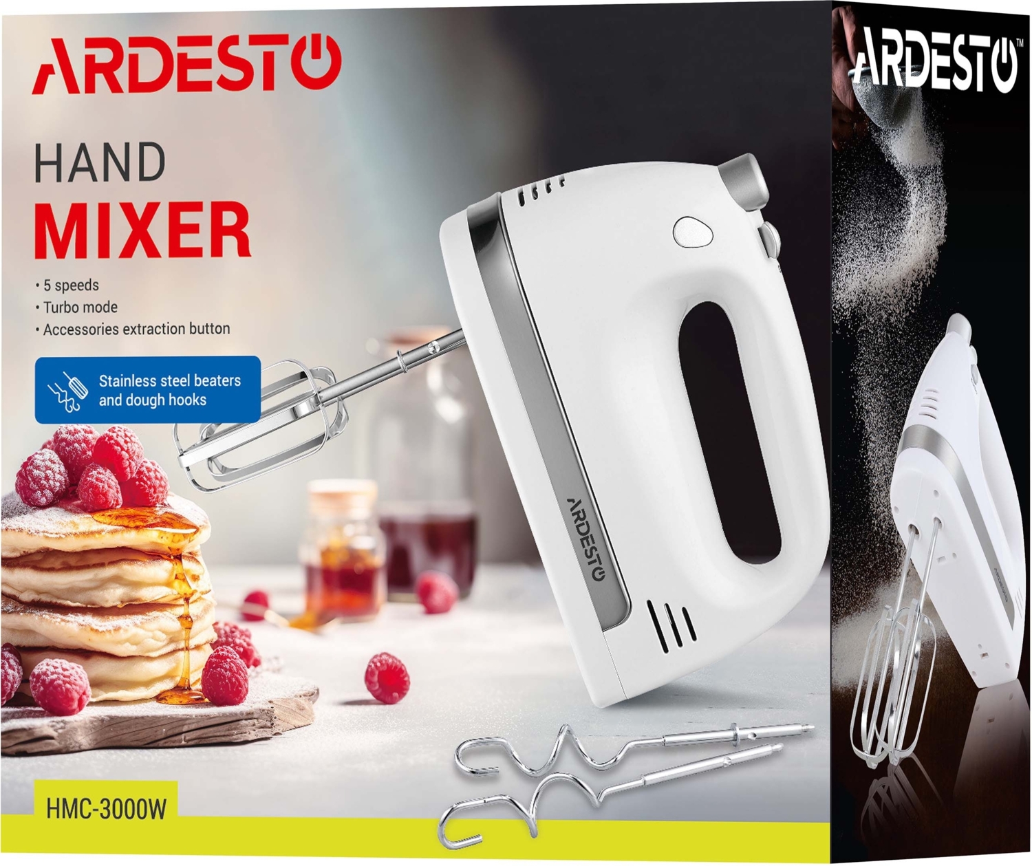 Ручний міксер Ardesto з двигуном з мідною обмоткою у корпусі білого кольору. Потужність пристрою становить 300 Вт. Міксер має компактний розмір, завдяки чому поміститься в кухонному ящику чи шафі.