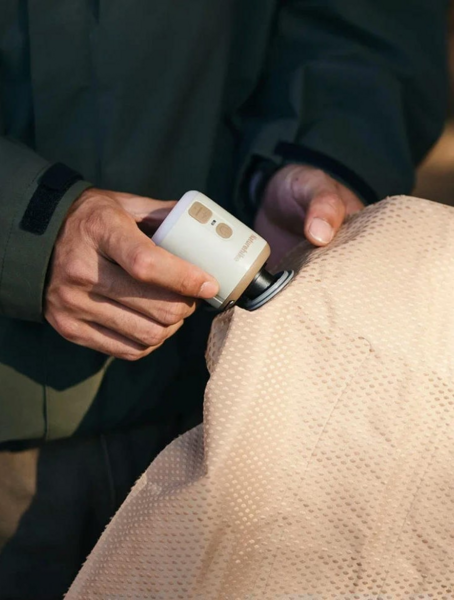 Пристрій може похвалитися захистом від випадкового ввімкнення. Щоб активувати помпу, потрібно двічі натиснути кнопку керування протягом 1 с. Матеріал конструкції — поєднання ABS-пластику та поліпропілену. Це робить корпус настільки легким (102 г), що його можна носити на шиї.