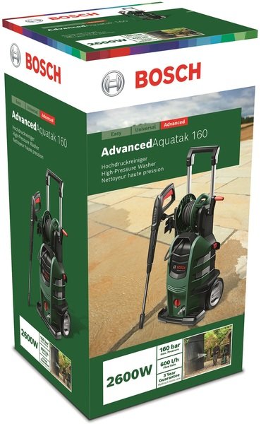 Компактний апарат високого тиску Bosch AdvancedAquatak 160 з потужним двигуном (2600 Вт), 4-циліндровим насосом, що самовсмоктує, з витратою води 570 л/год, тиском 160 бар. У комплекті з приладдям, що йде до нього, допоможе якісно відмити навіть від старого бруду будь-які предмети і поверхні, що знаходяться просто неба. Стіни та паркани, садові меблі, інструмент, доріжки та тераси, велосипеди, автомобілі – це і багато іншого легко привести в порядок, докладаючи мінімум зусиль.