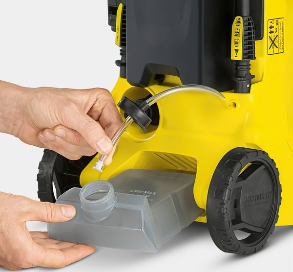 Мийка супер. Всім задоволений, за 5 років користування змінив тільки форсунку основної насадки. Бачок для миючого засобу на мою думку не потрібен, краще докупити окремий пінокомплект. 1 л засобу вистачає помити авто до 5 разів і якість не гірше від мийки самообслуговування. Для будинку незамінна річ. Рекомендую.
