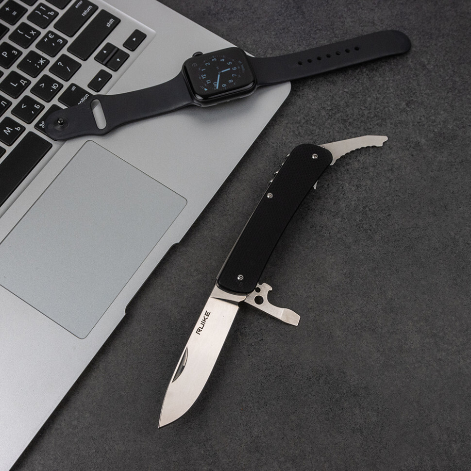 Серед інших корисних функцій — серрейторне лезо, знімне вушко для темляка, склобій на торці та щипці, приховані в одній із накладок рукояті. Усі елементи ножа Ruike L21 виготовлені з загартованої нержавіючої сталі Sandvik 12C27 і відзначаються якісним дзеркальним поліруванням.