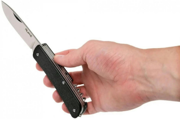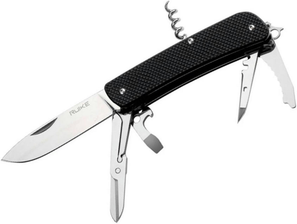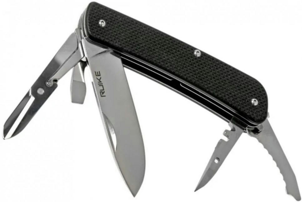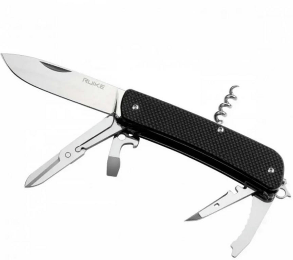 Ruike L31 — ідеальний вибір для тих, хто шукає не просто ніж, а багатофункціональний інструмент для вирішення широкого кола завдань як у побуті, так і в польових умовах. Ніж оснащений клинком форми Drop-point із гладкою заточкою, довжиною 85 мм і товщиною обуха 3,0 мм. Окрім основного леза, модель укомплектована пружинними ножицями, пласкою викруткою, поєднаною з відкривачкою, універсальним шилом, серрейторним лезом, склобоєм, темлячним вушком та знімними щипцями, які вбудовані в одну з накладок рукояті.