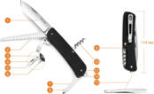 | Особливості конструкції | Інструмент для закручування дроту, Інструмент для огоління дроту, Кліпса, Викрутка пряма, Відкривачка, Пила, Пінцет, Склобій, Стропоріз, Штопор |