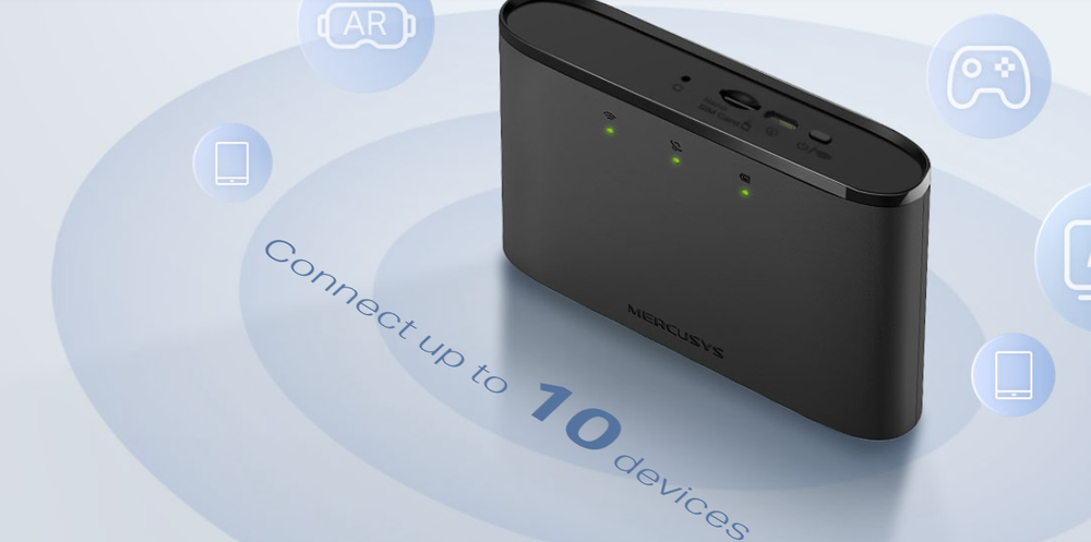 Значна кількість бездротових пристроїв без проблем сумісна з цим невеликим мобільним хотспотом. MT110 підтримує до 10 одночасних підключень 4G/3G для планшетів, ноутбуків, мобільних телефонів та інших пристроїв.