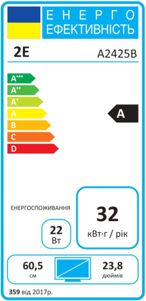 Монітор 2E A2425B забезпечує гідну якість зображення за оптимізованого енергоспоживання. В режимі очікування пристрій споживає менше 0,5 Вт, що сприяє зменшенню витрат на електроенергію. Максимальне споживання - 36 Вт. Завдяки зовнішньому блоку живлення забезпечується стабільна робота та мінімізується ризик перегрівання, що гарантує тривалий термін служби пристрою.
