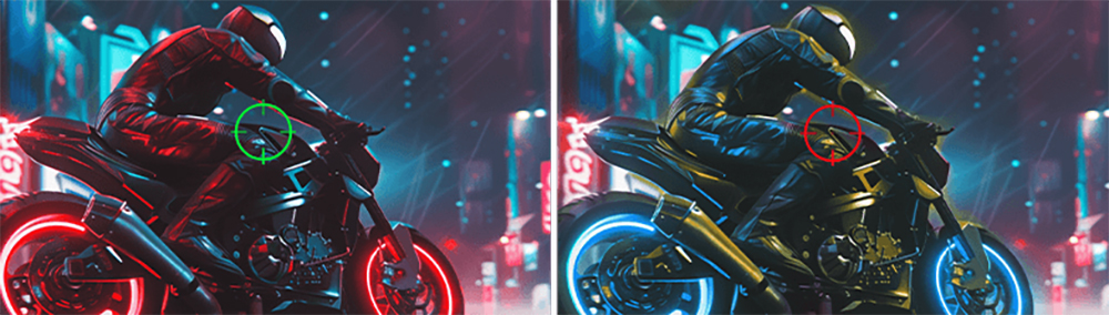 Коли перехрестя прицілу збігається за кольором із фоном, стріляти некомфортно. Щоб вирішити цю проблему, монітор MSI автоматично змінює кольори прицілу в такий спосіб, щоб той виділявся на екрані.