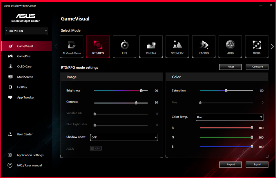 Технологія ASUS GameVisual пропонує сім попередньо встановлених режимів відображення для оптимізації зображення для різних типів контенту. Ця унікальна функція легко доступна за допомогою гарячої клавіші або через меню налаштувань OSD.