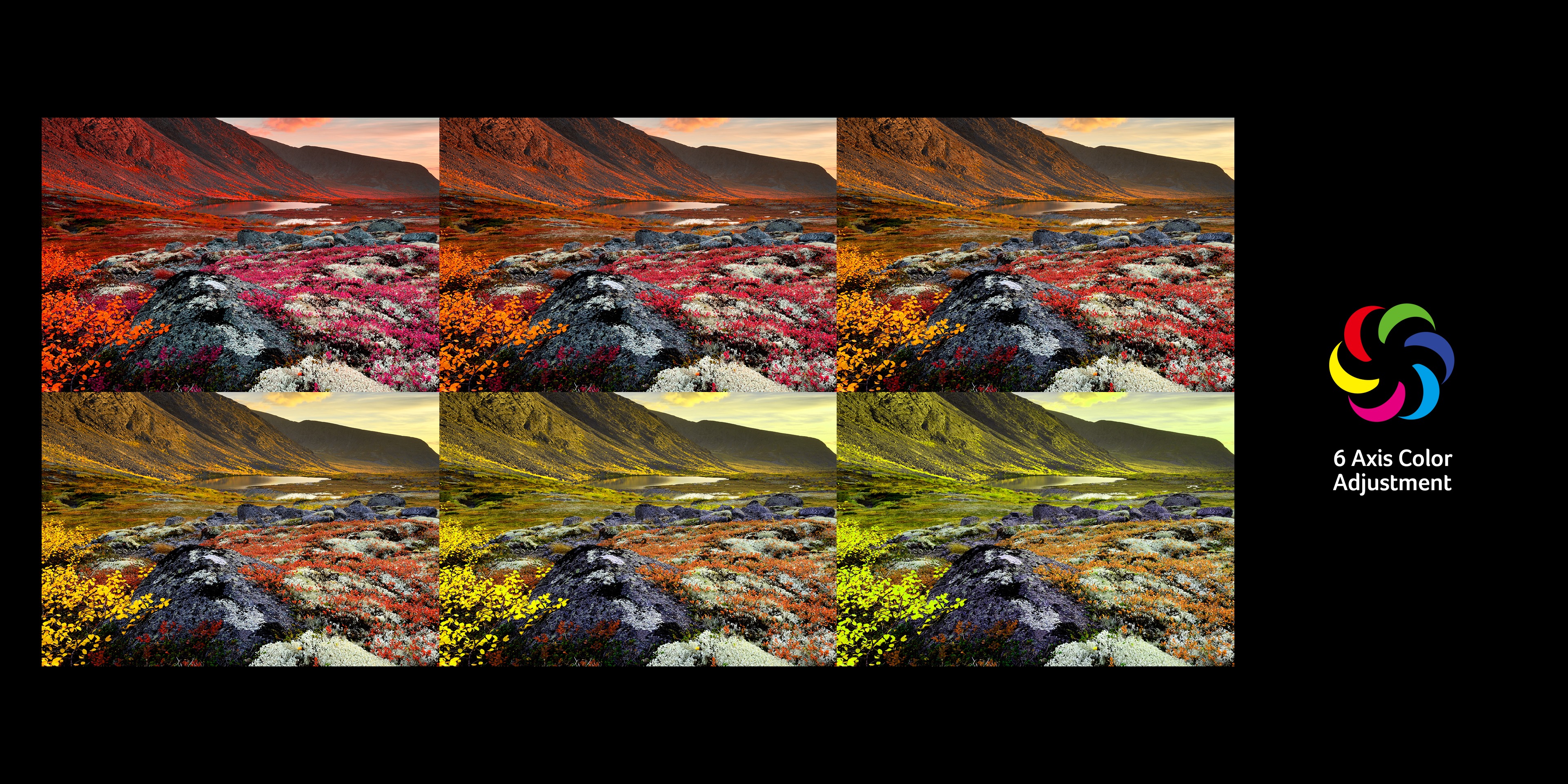 Монітори Acer використовують унікальну форму 6-осьового налаштування кольорів, що допомагає професіоналам досягти необхідних точних кольорів та відтінків. Використовуючи цю функцію, користувач може налаштувати відтінок та насиченість у 6 осях. Ці осі змінюються від R, G, B до C, M та Y, що дозволяє користувачеві забезпечувати кольори монітора залежно від професійних потреб.
